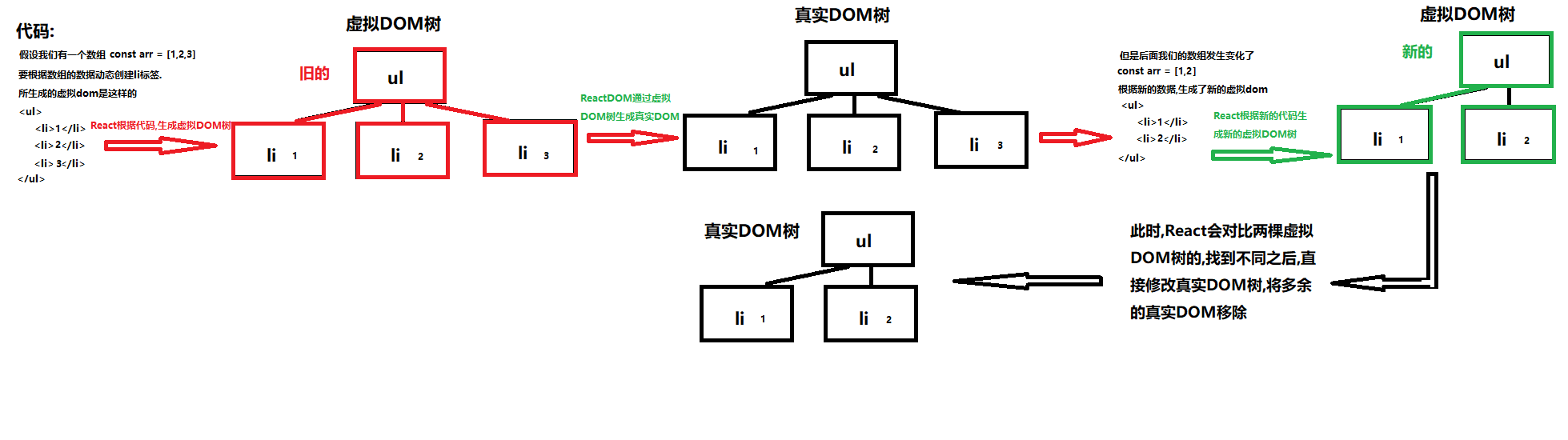 通过 React 命令式或声明式语法,创建出来的元素就是虚拟 dom. 根据第一个挂载渲染的结构,生成第一棵虚拟 DOM 树,更新后,生成第二棵 虚拟 DOM 树. 然后比较两个新旧虚拟 DOM 树,找到不同,去修改真实 DOM 树,从而实现代价最小的页面更新